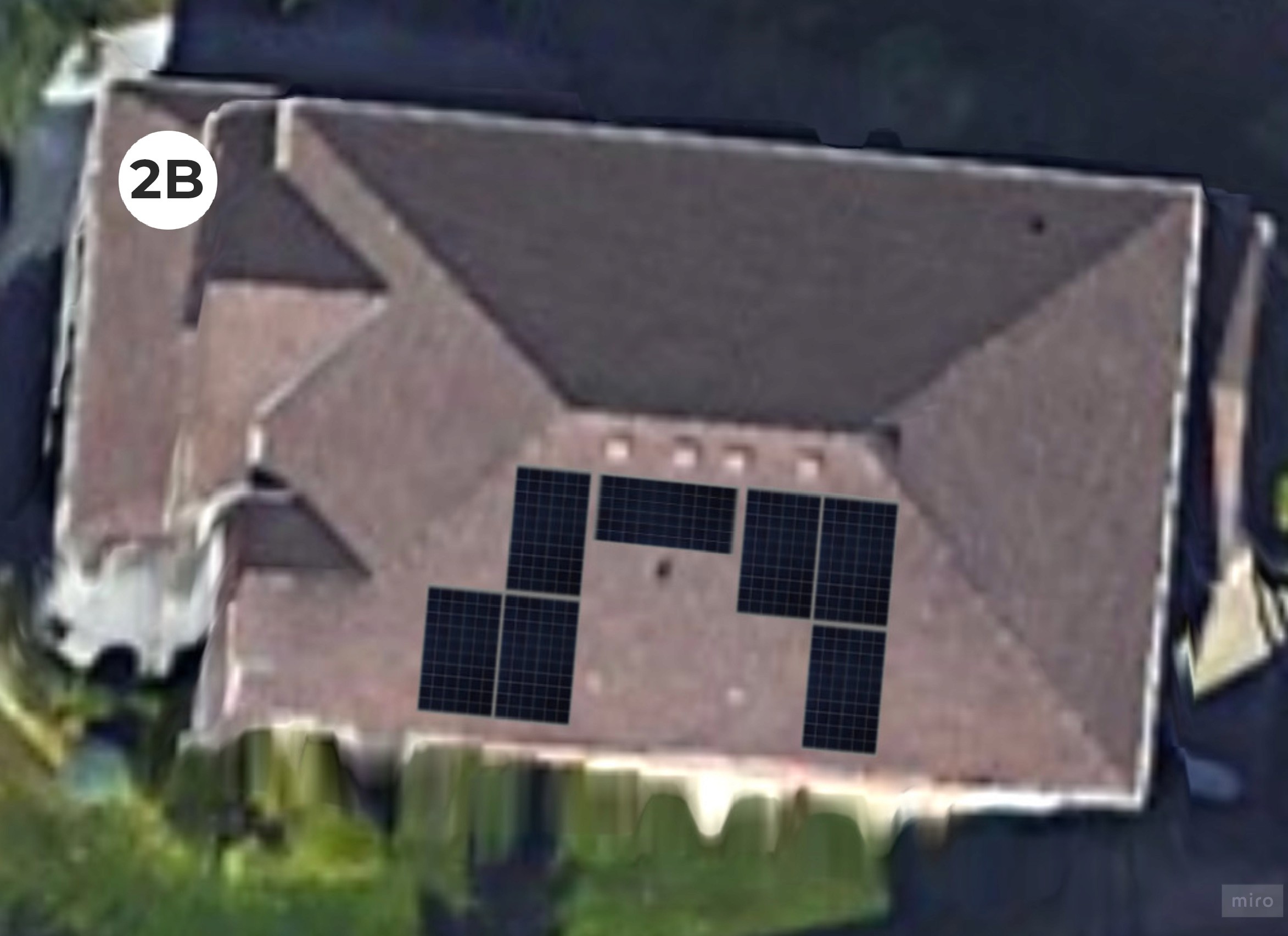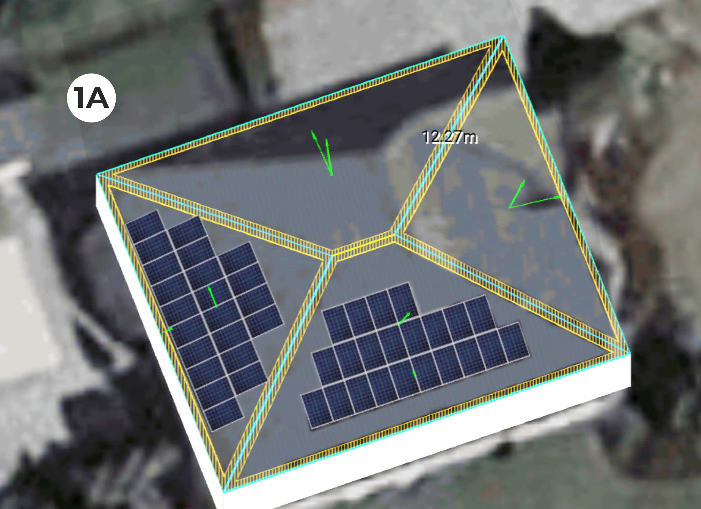 This home is well-oriented for sun, since south and west facing roofs generate the most solar energy. It has ample roof space, no shading, and a low roof slope, which makes installation quicker and easier. The images below show a simulated design for solar panels with a net metered system (Fig 1A) and a design for solar zero export (Fig 1B). This is the ideal scenario for both net metering and solar zero export.