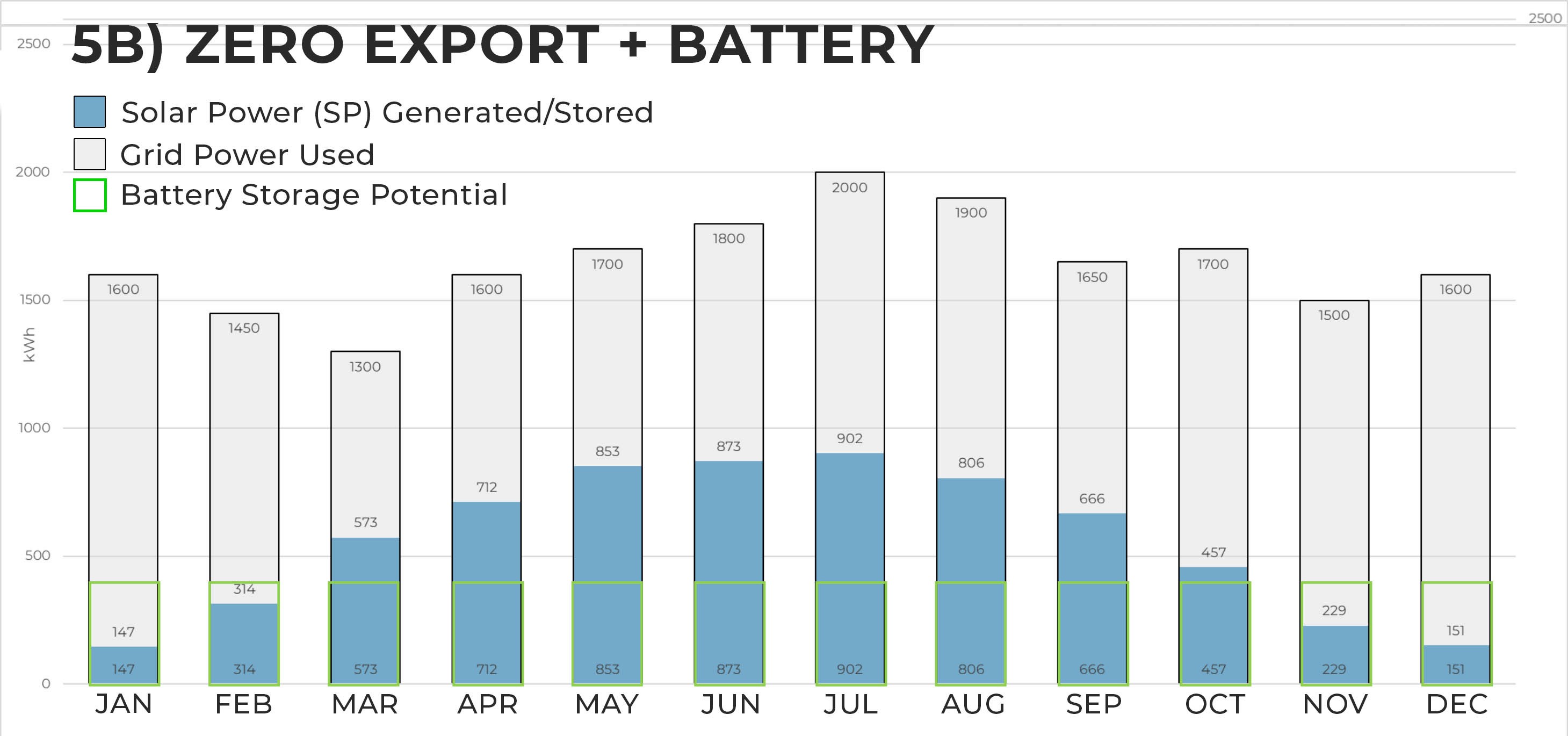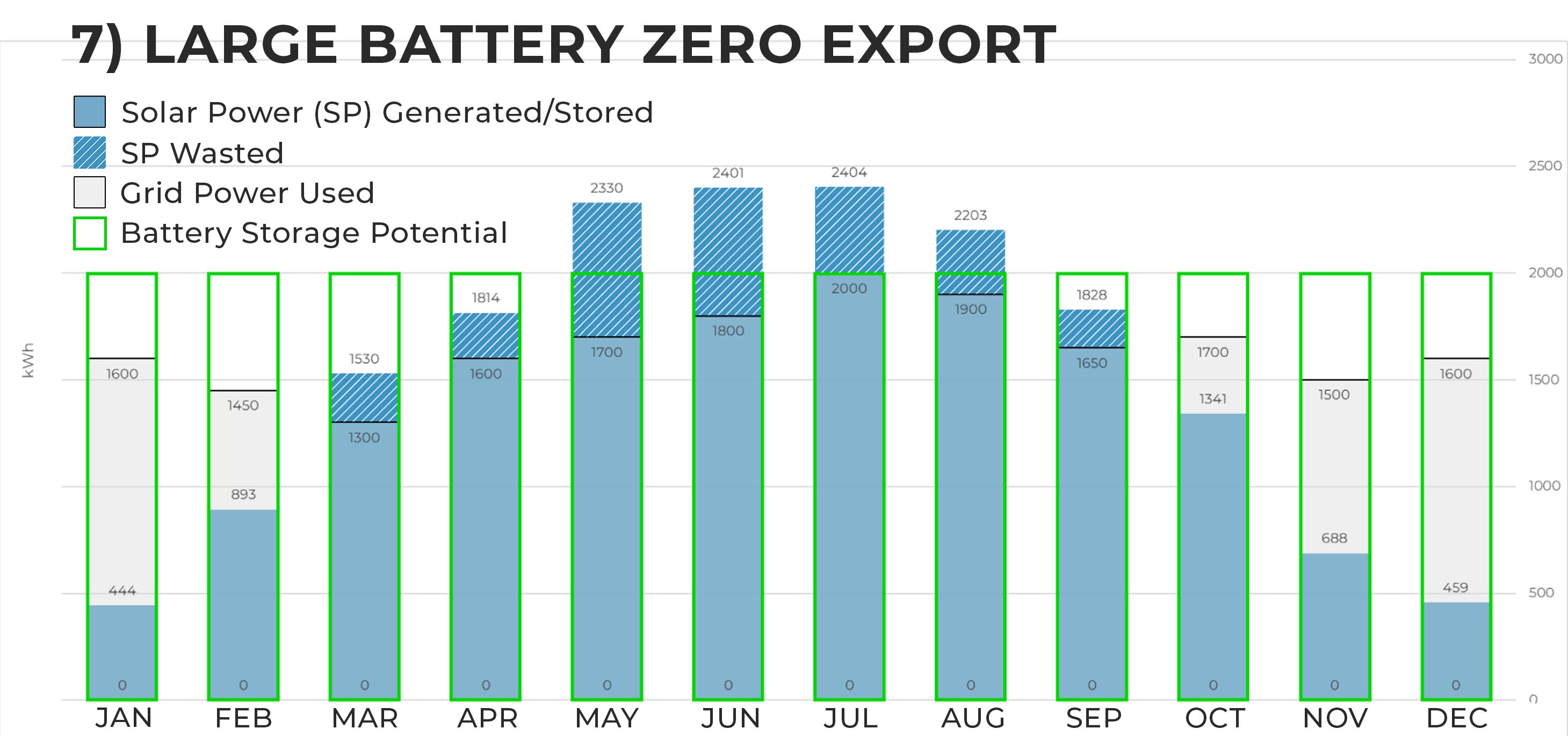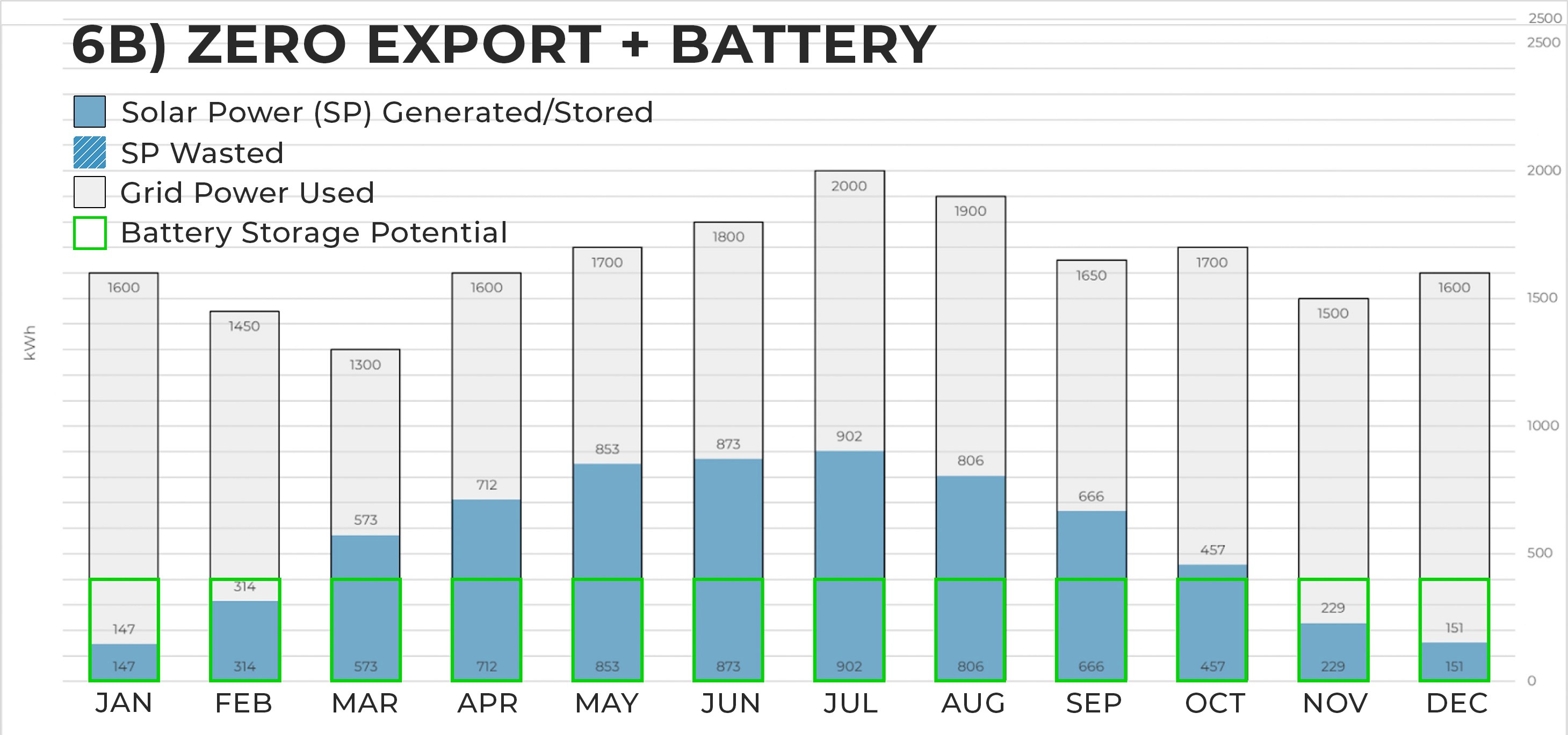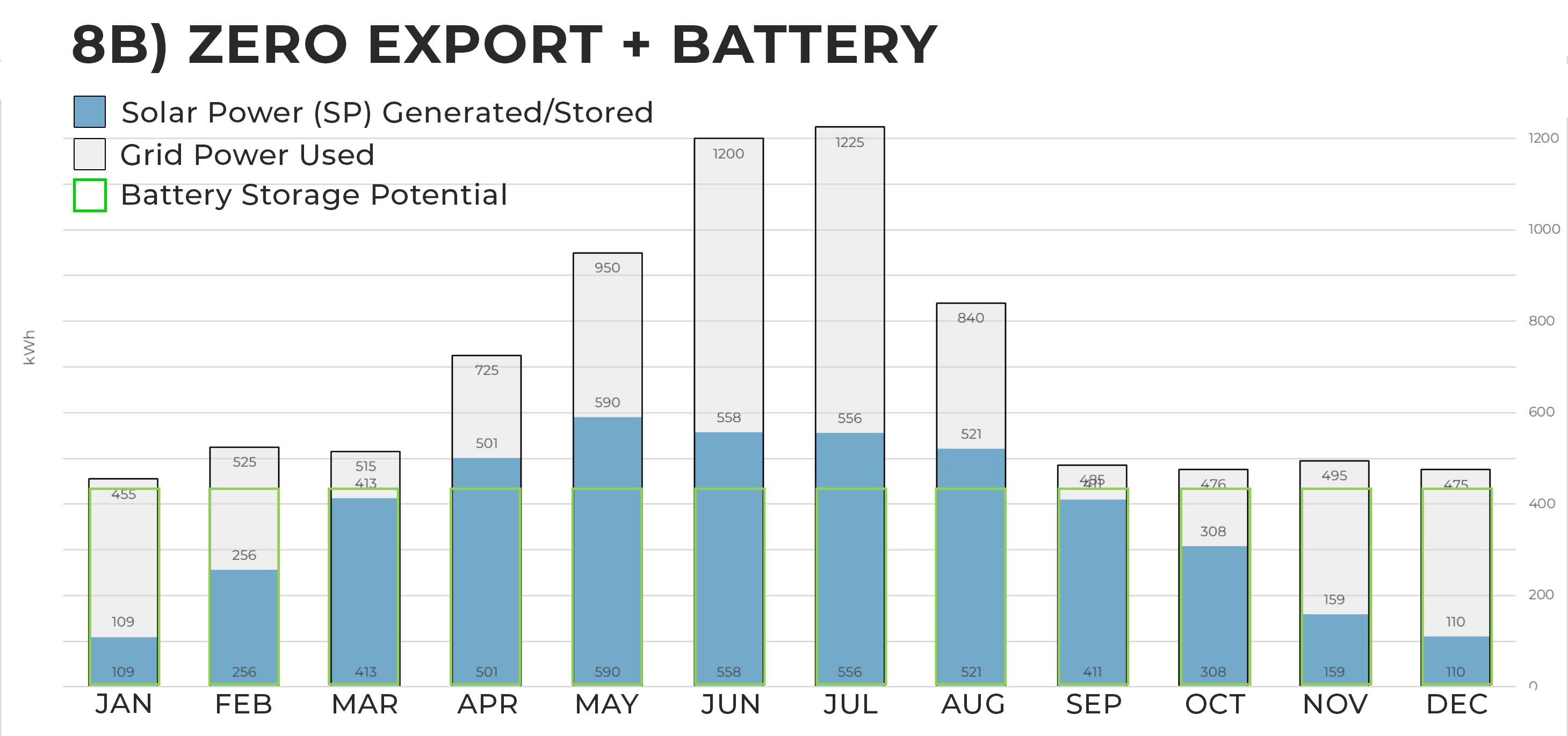 A key advantage of this zero export plus battery system is that the battery is well-matched to the solar generation, minimizing wasted energy. However, despite this efficiency, it falls short of net metering in terms of long-term financial returns and overall energy production.