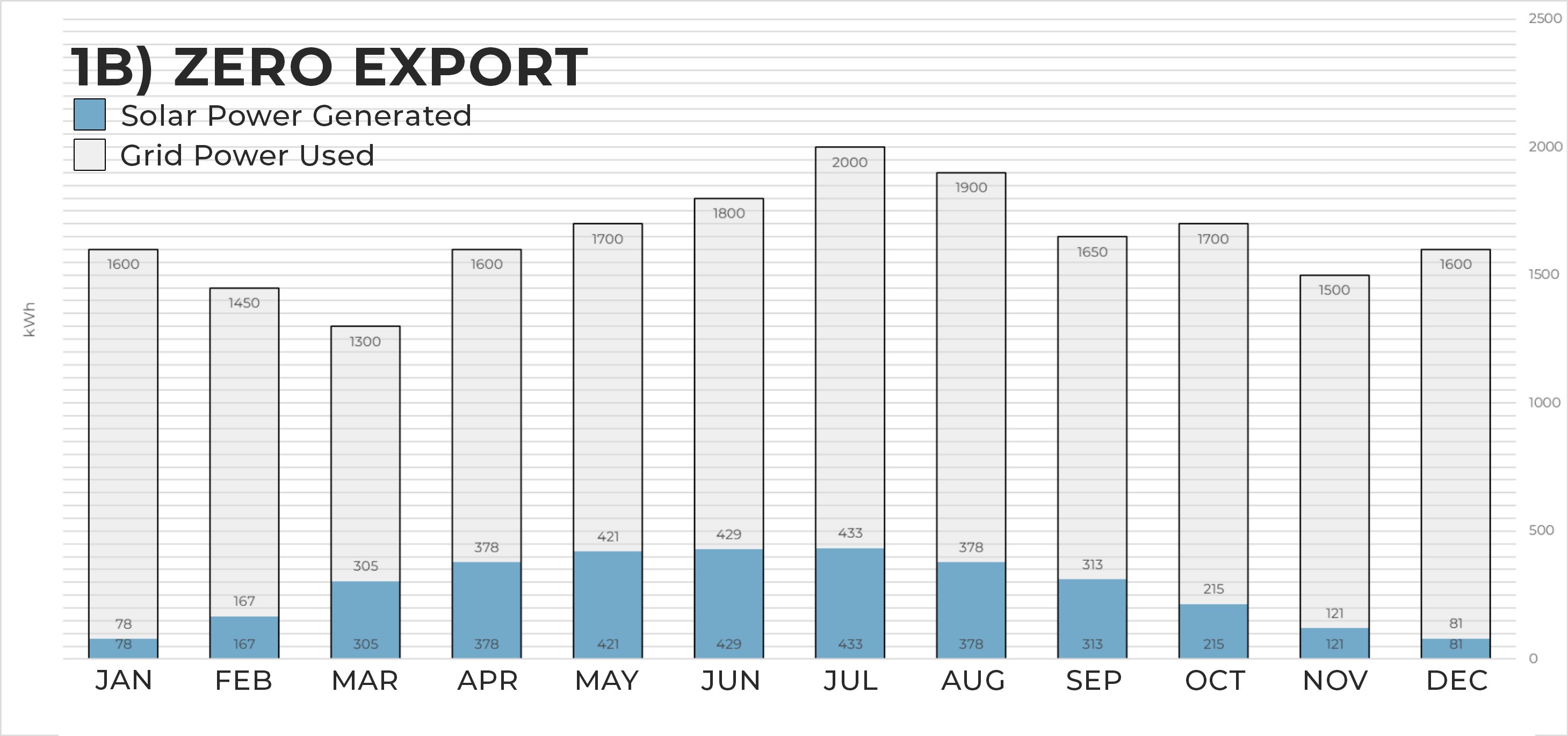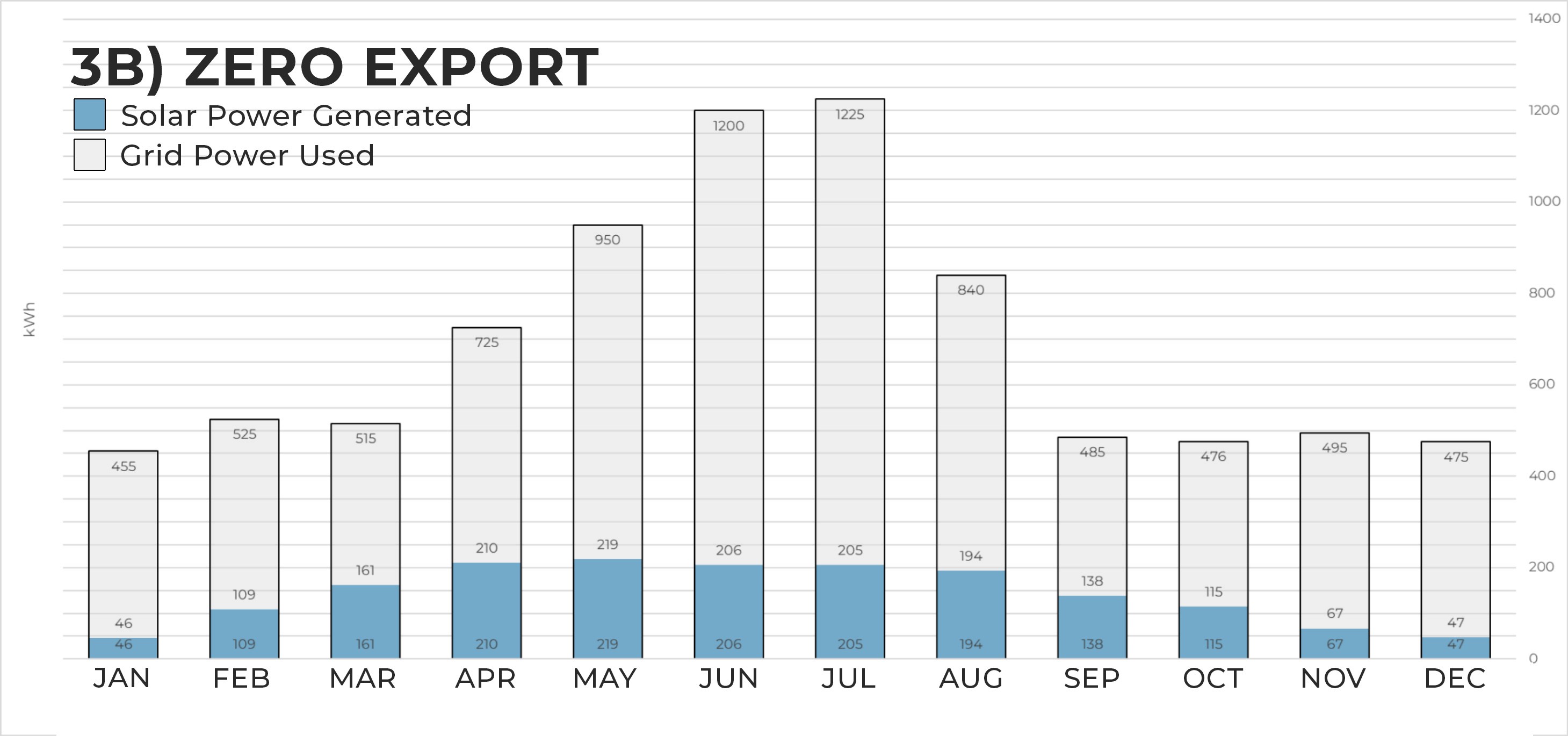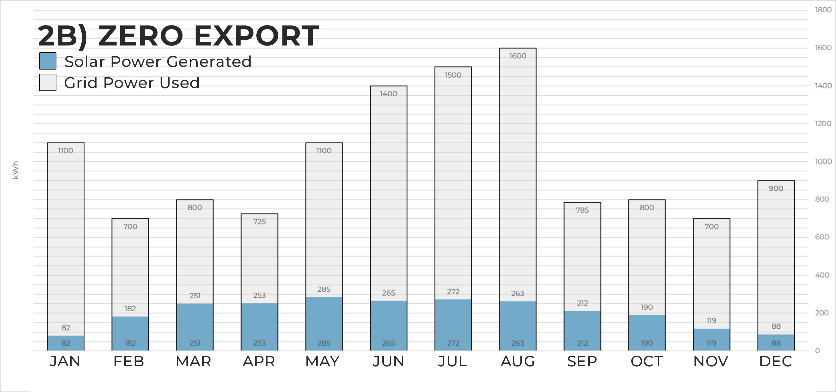 Solar Scenario 2B) Solar Zero Export System: This system would be significantly smaller than the net metered system, providing just 20.3% of yearly consumption. It was designed to match real-time energy use and avoid overproduction, which minimizes wasted solar energy.