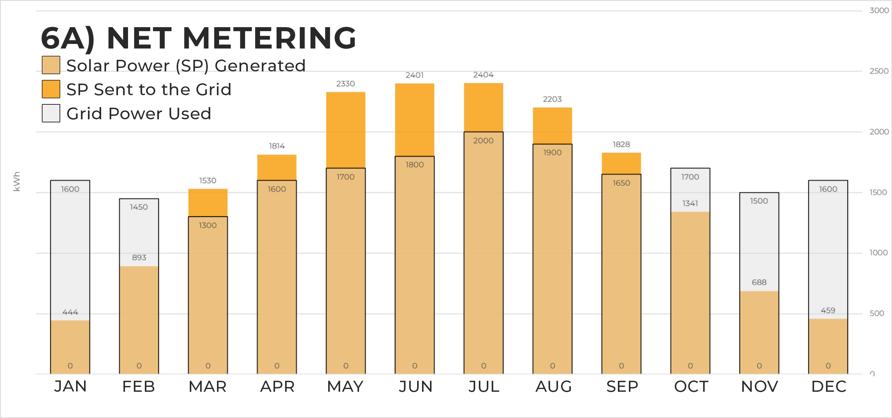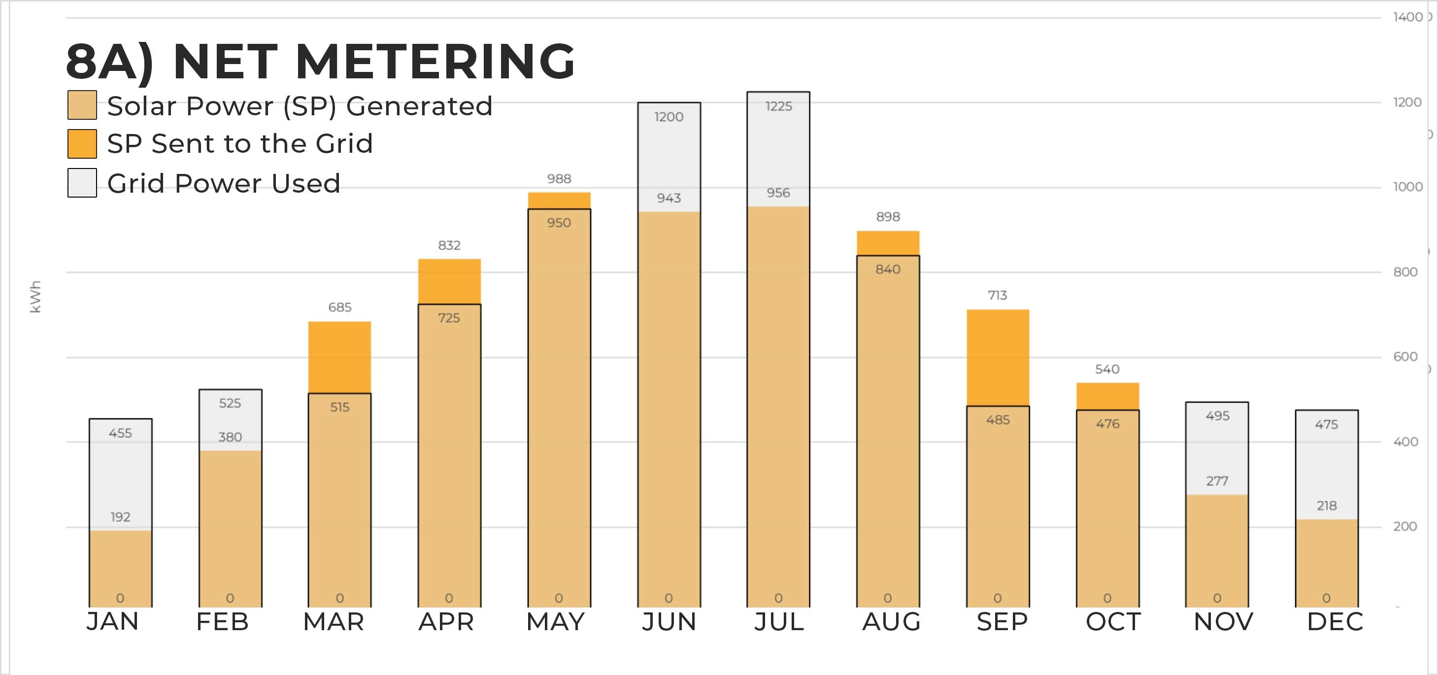 This system is designed to generate excess energy during the daytime and warm months when there are longer days and more sunlight, exporting excess energy to the electrical grid to use at nighttime and winter months.